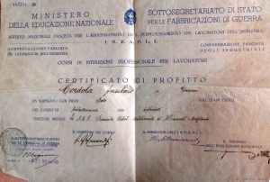 Certificato di profitto rilasciato il 8 ottobre 1941 XIX a Cordola Anselmo dipendente del dinamitificio Allemandi di Avigliana, del corso di addestramento per esplosivi