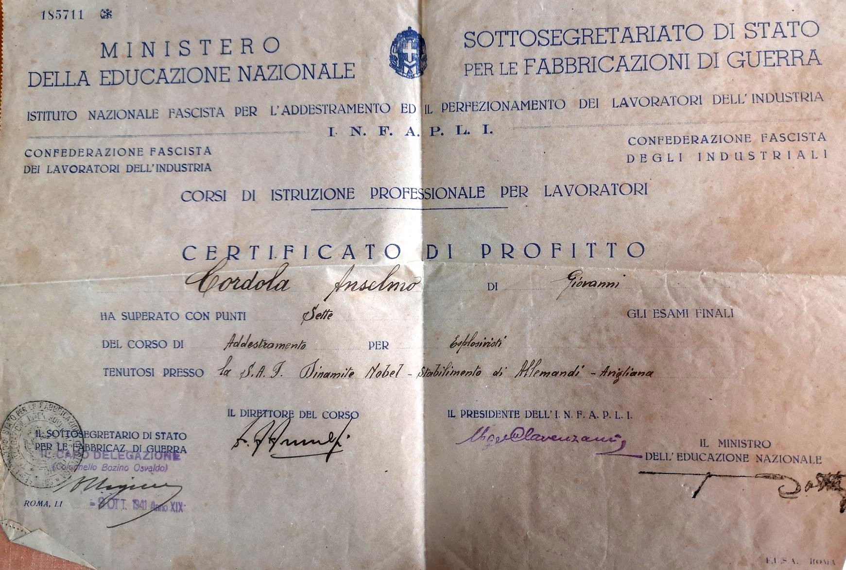 Certificato di profitto rilasciato il 8 ottobre 1941 XIX a Cordola Anselmo dipendente del dinamitificio Allemandi di Avigliana, del corso di addestramento per esplosivi