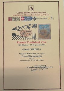 Il 15 gennaio, alle 15,30 nella sede della Città metropolitana di Torino (Corso Inghilterra 7, Torino), questo racconto ha avuto l’onore di essere tra i premiati del Concorso “Tradizioni Vive” giunto alla sua dodicesima edizione, nella sezione Piemont ch’a scriv. L’evento ha visto l’intervento artistico della Compagnia dell’Amarena di Trofarello. La giuria, era composta da Michele Bonavero, Marina Gallia, Bruno Giovetti, Filomena Iovinella, Gianfranco Pavesi ed Ernesto Vidotto.
