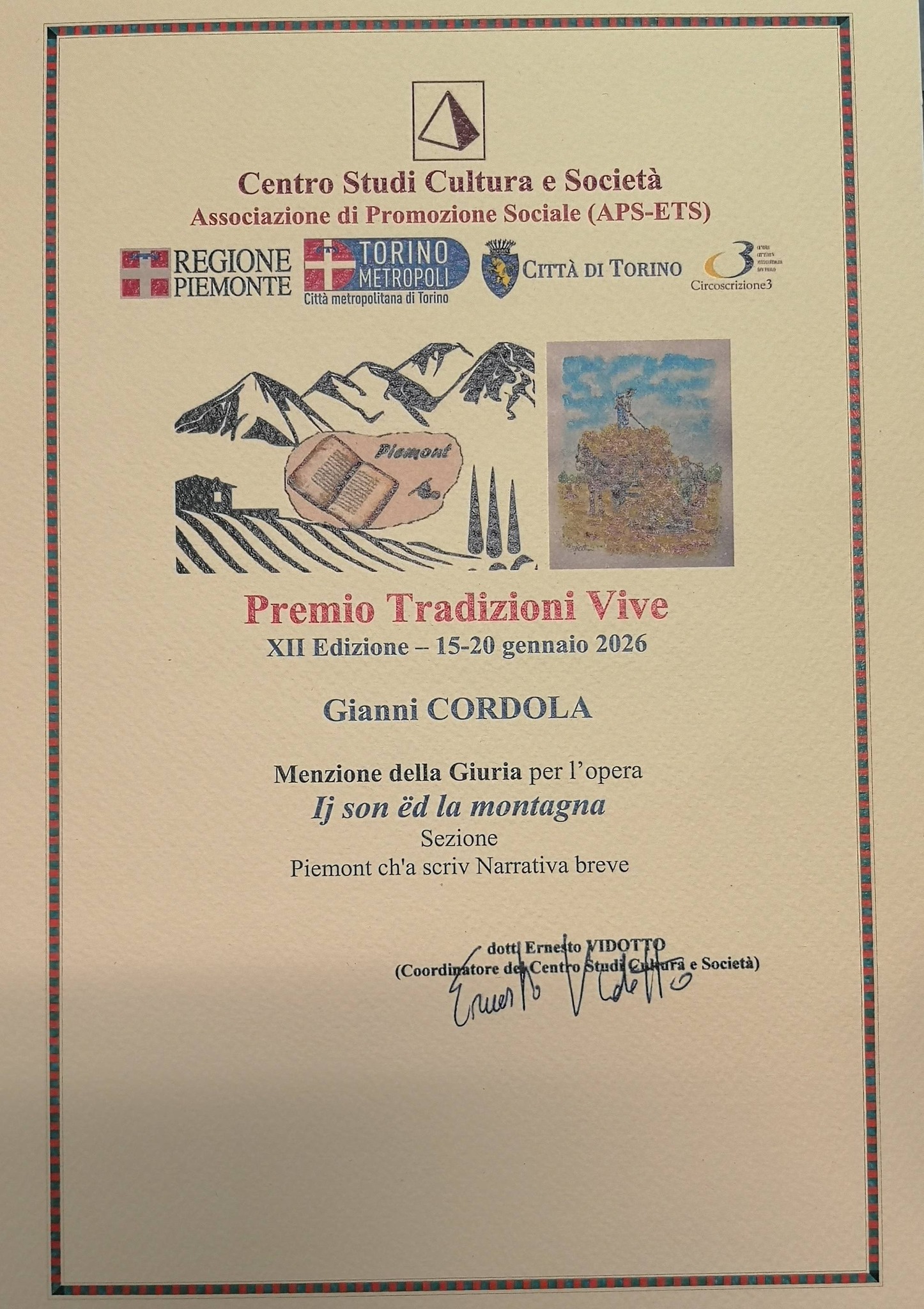 Il 15 gennaio, alle 15,30 nella sede della Città metropolitana di Torino (Corso Inghilterra 7, Torino), questo racconto ha avuto l’onore di essere tra i premiati del Concorso “Tradizioni Vive” giunto alla sua dodicesima edizione, nella sezione Piemont ch’a scriv. L’evento ha visto l’intervento artistico della Compagnia dell’Amarena di Trofarello. La giuria, era composta da Michele Bonavero, Marina Gallia, Bruno Giovetti, Filomena Iovinella, Gianfranco Pavesi ed Ernesto Vidotto.